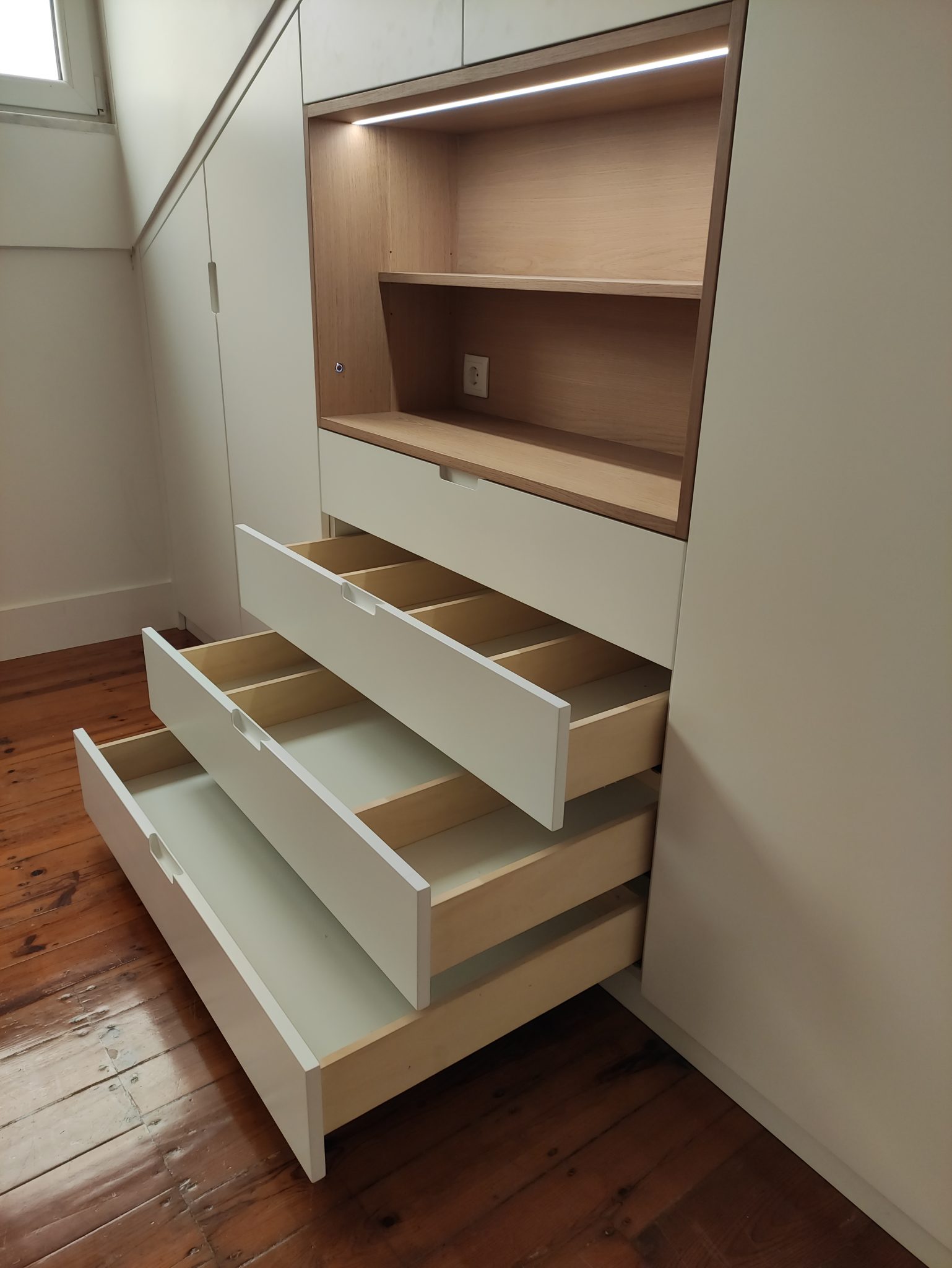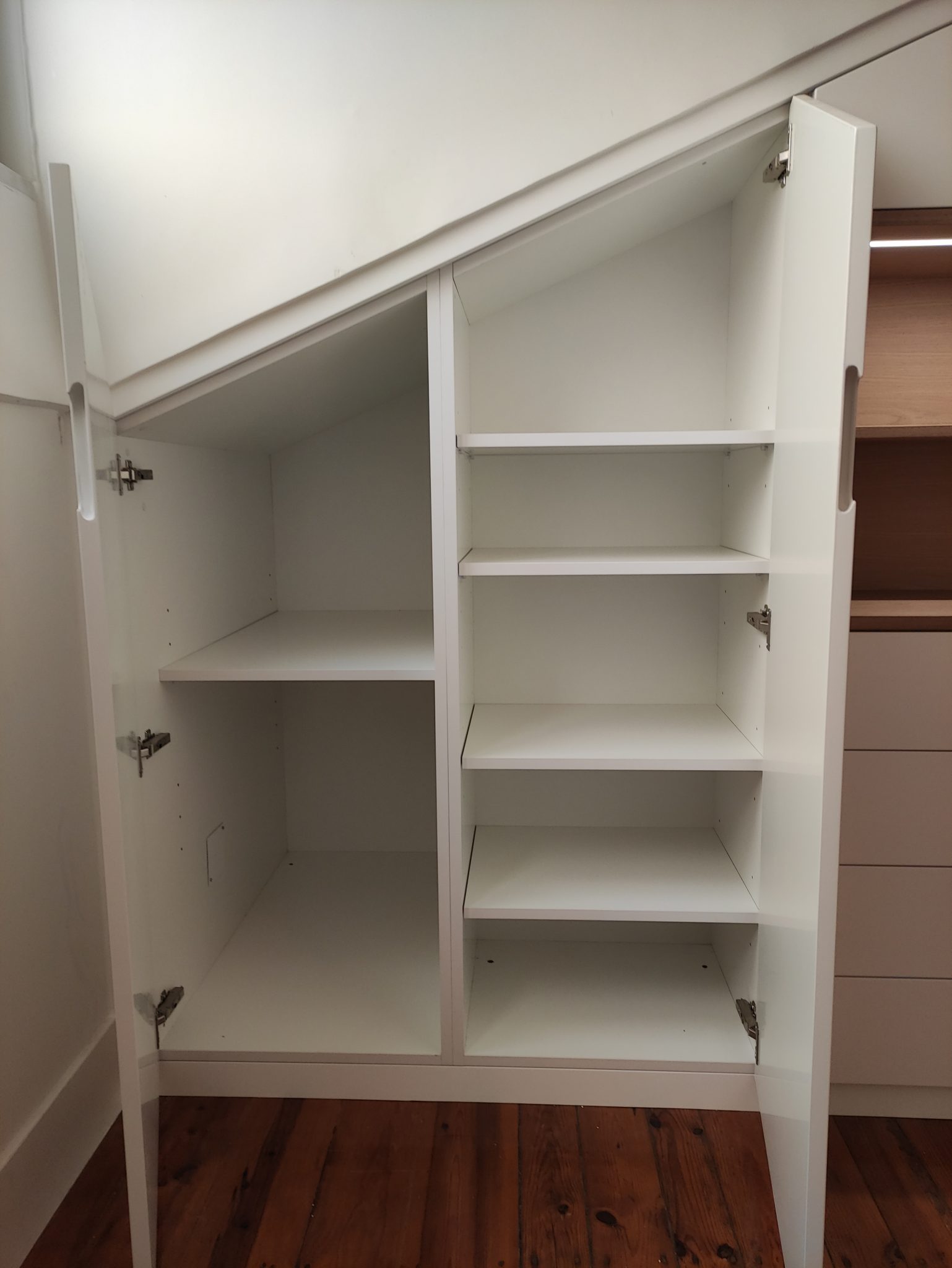 Um roupeiro em esconso é muitas vezes a solução ideal para uma arrumação extra no centro histórico de Lisboa, quer seja em apartamentos ou espaços de trabalho, assim como em moradias de dentro e fora da cidade. Tirar o máximo proveito ao espaço disponível, normalmente debaixo de telhado leva-nos a criar elementos de fácil acesso, puxando a ergonomia dos componentes ao máximo, e mantendo um visual mais sóbrio ou arrojado, conforme gostos, e sem nunca esquecer a qualidade nos materiais, acabamentos e cuidado na fabricação.